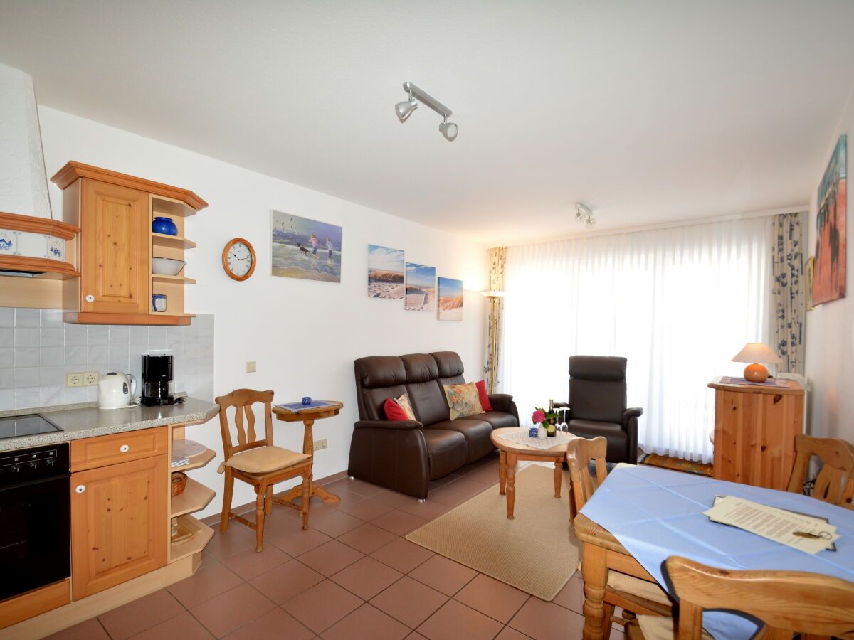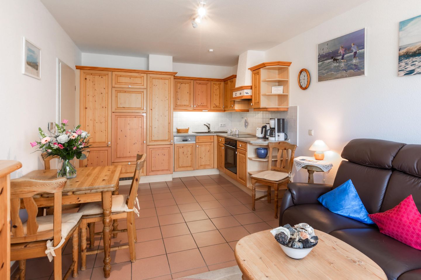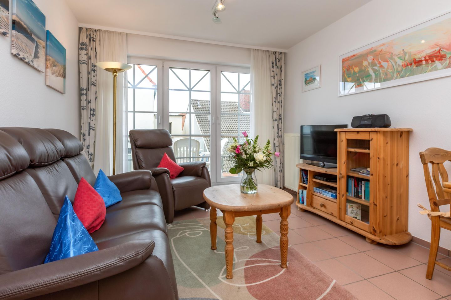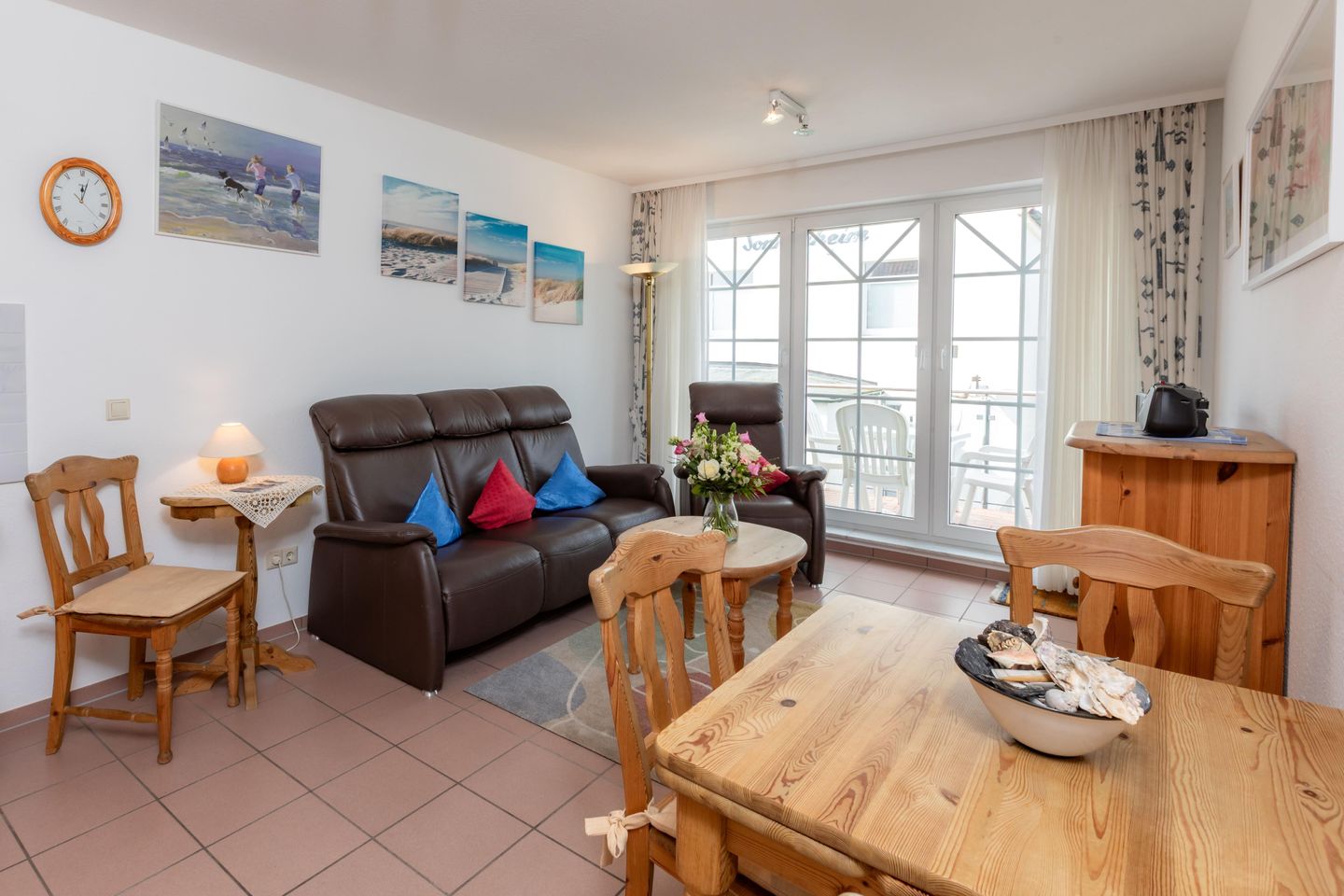 • Offener Wohnbereich mit gemütlicher Sofaecke, Esstisch und Zugang zum Balkon. Vom Süd-West-Balkon genießen Sie die Sonne bis in die Abendstunden sowie einen seitlichen Blick auf das Wattenmeer.