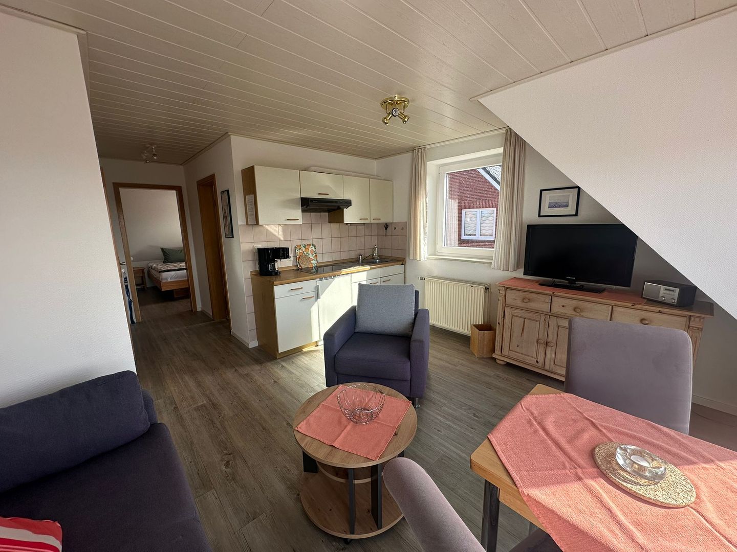 Im Wohnbereich lädt die Sofaecke zum Entspannen ein, während ein Esstisch für gemeinsame Mahlzeiten zur Verfügung steht. Für Unterhaltung steht ein TV mit 1 Gerät (25–34 Zoll) bereit. Ergänzend sind Radio und WLAN vorhanden, sodass Sie auch im Urlaub online bleiben können. Zur weiteren Ausstattung zählen Garderobe, Kommode und Rauchmelder.