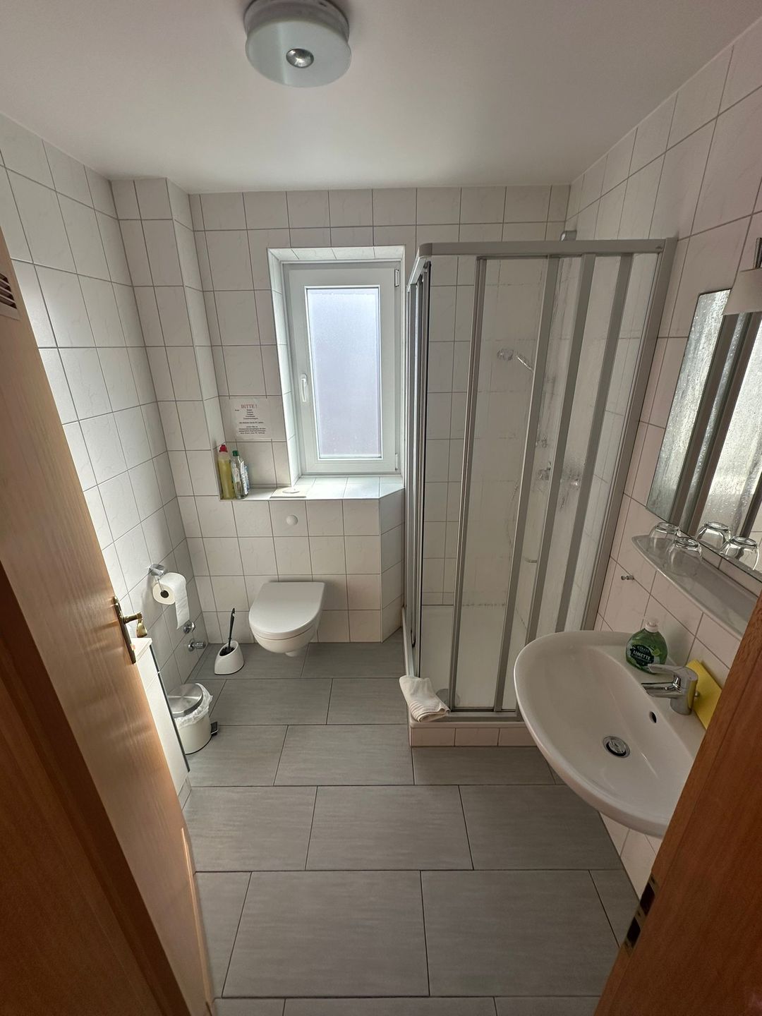 Das Badezimmer ist mit Dusche ausgestattet, wobei die Dusche als Kombination mit Wanne beschrieben ist. Zusätzlich gehören Waschbecken, WC, Spiegel und ein Haartrockner zur Ausstattung.